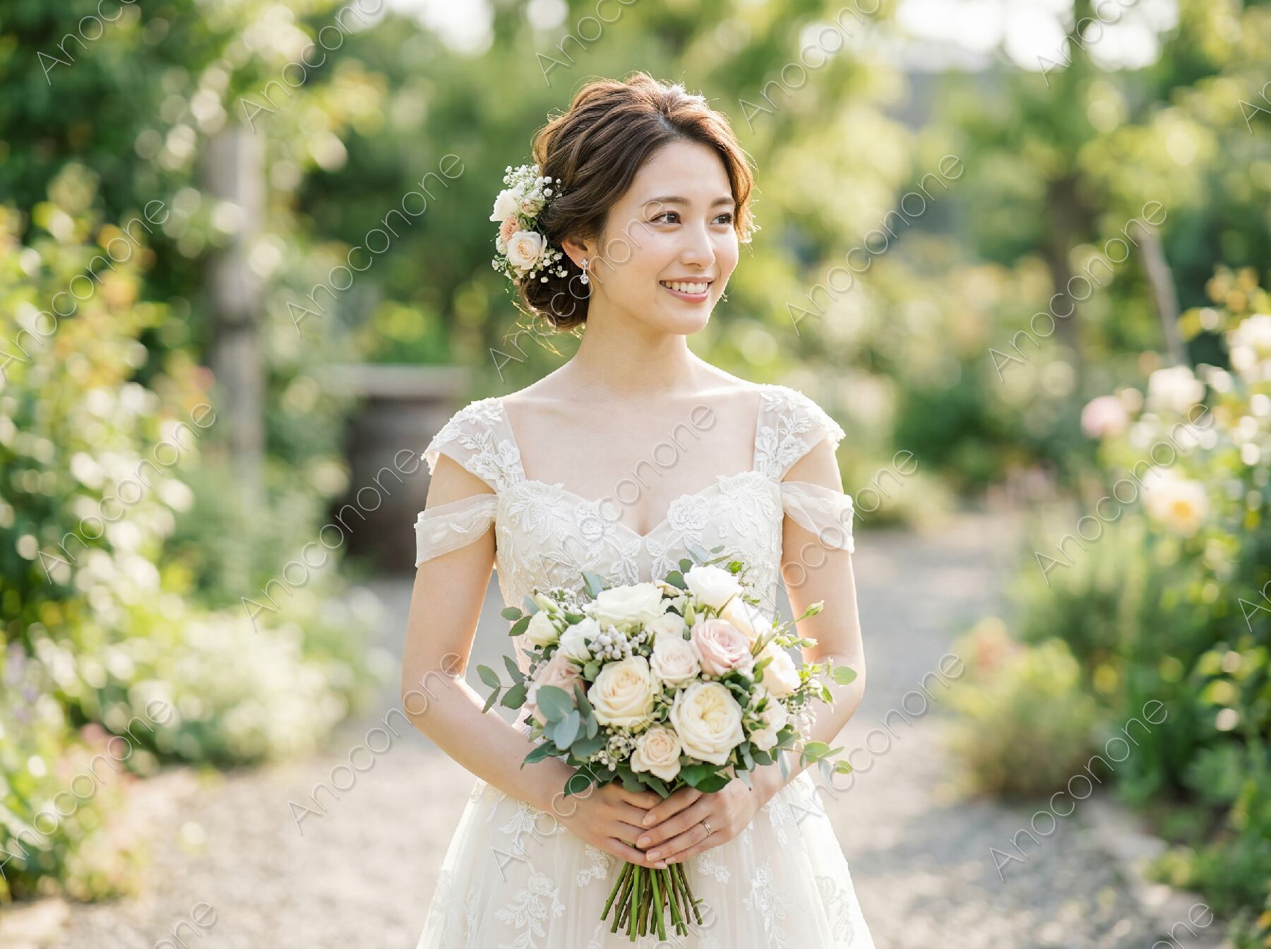 画像素材:緑豊かなガーデンを背景に、純白のウェディングドレスを身に纏った女性が穏やかな笑顔を浮かべているポートレートです。手元には、白バラを基調とした瑞々しいブーケが大切に抱えられています。ドレスには繊細な刺繍が施されており、オフショルダーのデザインが女性の優雅で清らかな雰囲気を引き立てています。緩やかにまとめられた髪には、可憐な生花の髪飾りが添えられ、耳元で揺れるイヤリングが上品なアクセントになっています。背景の草花は柔らかな光を浴びて美しくぼかされており、祝福に満ちた温かな空気感が画面全体に広がっています。肌の質感や瞳の輝き、ブーケの花びら一枚一枚まで丁寧に描写された、奥行きのある構成が特徴的です。ウェディング関連のプロモーションや、特別な日の思い出を象徴する素材に最適な一枚です。