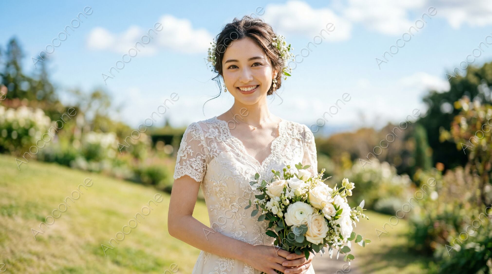 画像素材:澄み渡る青空と柔らかな陽光が降り注ぐなだらかな丘の上で、繊細なレース刺繍が施された半袖のウェディングドレスを纏った女性が、優しく穏やかな表情で微笑んでいます。女性の手元には白バラやラナンキュラスを基調とした上品なクラッチブーケがあり、清楚なドレスの美しさをより一層際立たせています。ヘアスタイルはふんわりとまとめられ、散りばめられたかすみ草のような白い小花が可憐な印象を与え、耳元で揺れるパールのイヤリングが顔周りを華やかに彩っています。背景には遠くまで広がる緑豊かな庭園と青い空が広がり、開放感あふれるロケーションが多幸感に満ちた瞬間を美しく演出している一枚です。ブライダルフェアの告知や、結婚式場のウェブサイト用メインビジュアル、ウェディングドレスのカタログ、幸せな門出をテーマにしたライフスタイル雑誌の誌面など、幅広い用途に適しています。ブライダルシーンの魅力を伝える高品質な素材です。
