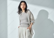 明るい日差しが差し込むスタジオで、白を基調とした涼しげな夏ファッションに身を包んだ女性の画像素材です。透け感のある薄手のシャツを羽織り、インナーには細かなリブ編みのニットを合わせたレイヤードスタイルが特徴です。全体的にワントーンでまとめられた服装が、都会的で洗練された雰囲気を演出しています。背景の壁には影が落ちており、光のコントラストが写真に奥行きを与えています。女性の表情は落ち着いており、こちらを静かに見つめる視線が印象的です。アクセサリーにはゴールドのネックレスやバングルを合わせており、細部までこだわりが感じられるスタイリングになっています。髪の毛が風になびくような自然な動きもあり、清潔感と開放感のある一枚に仕上がりました。ファッション誌のイメージカットや、ライフスタイルを提案するブログ、夏の特集記事などの背景素材として幅広く活用できます。大人のナチュラルな装いを求める方に最適な素材です。