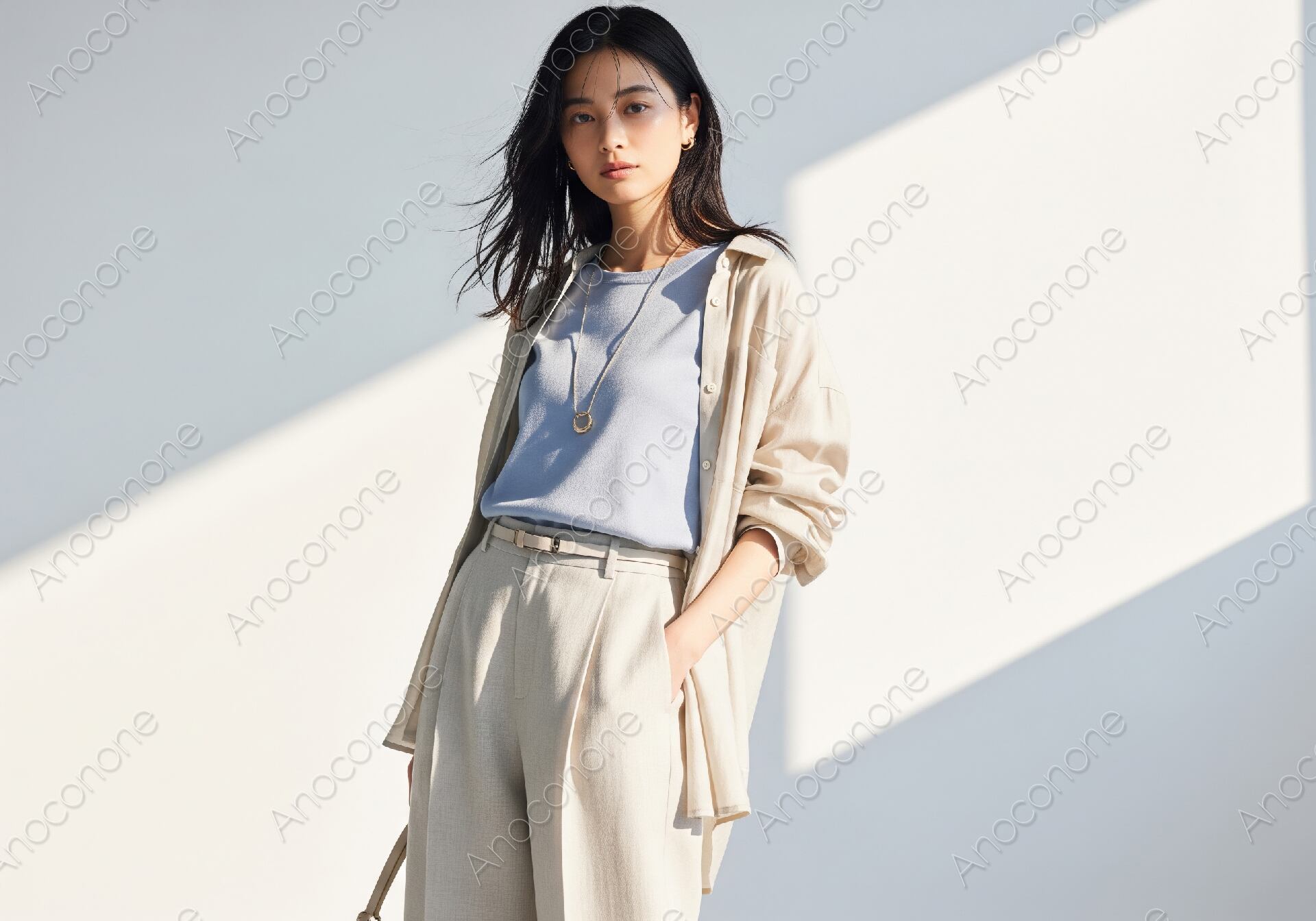 明るい日差しが差し込む空間で、爽やかなブルーのインナーとアイボリーのシャツを合わせた夏らしいコーディネートの女性を捉えた画像素材です。風に軽くなびく黒髪と、こちらを静かに見つめる落ち着いた表情が、都会的で洗練された雰囲気を醸し出しています。ボトムスにはゆったりとしたシルエットのパンツを合わせ、ベルトでウエストマークすることでスタイル良くまとめられたスタイリングです。背景に落ちる斜めの光と影のコントラストが、写真全体に立体感とモダンな印象を与えています。首元に光るシンプルなサークル型のネックレスがアクセントとなり、大人のナチュラルな美しさを引き立てています。ファッション系メディアのアイキャッチや、夏の新作アパレルを紹介するブログ、ライフスタイル提案型の広告デザインなど、幅広い用途で活用いただけるクオリティです。清潔感のあるポートレートを探している方に最適です。