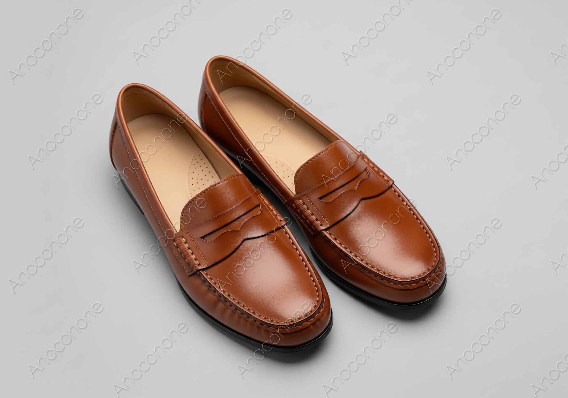 明るいグレーの背景に、滑らかな質感のブラウンレザーを使用したコインローファーを配置した画像素材です。靴の表面には程よい光沢があり、丁寧に仕上げられたステッチや切り込みのディテールが高級感を演出しています。内側はベージュのレザーが使われており、清潔感のある印象を与えます。クラシックなデザインでありながら現代的なシルエットに整えられているため、ビジネスシーンからカジュアルな休日スタイルまで幅広く対応可能です。左右の靴がバランスよく並べられており、商品のフォルムが分かりやすい構図になっています。ファッションサイトの製品紹介や、コーディネートの提案、靴の手入れに関するブログ記事のアイキャッチなど、多目的に活用いただけるクオリティです。シンプルで無駄のない背景は、文字入れなどの加工もしやすく、バナー作成にも適しています。足元から品格を高める革靴を探している方に最適な一枚です。