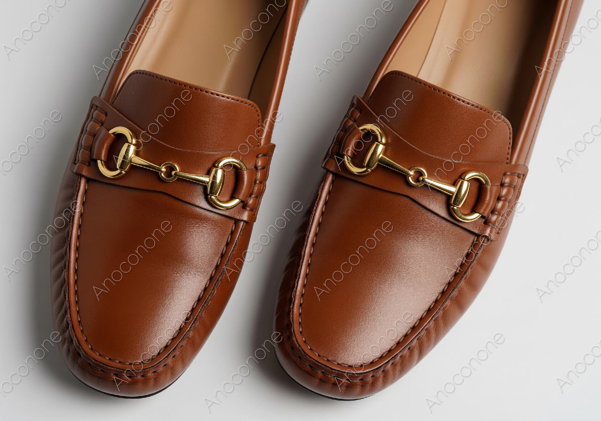 落ち着いたブラウンのレザーに、華やかなゴールドのビット金具がアクセントとなったローファーのクローズアップ画像です。滑らかでキメの細かい革の質感が、光を受けて上品な陰影を作り出しており、丁寧に施されたステッチがクラフトマンシップを感じさせます。甲の部分にあしらわれた金属パーツは、トラディショナルな雰囲気にエレガントな要素を加え、足元を華やかに演出します。背景をシンプルにすることで、靴自体のフォルムと細かなディテールがはっきりと強調された構成になっています。クラシックなスタイルを好む方や、きれいめなカジュアルコーディネートを提案したい場面に適した一枚です。アパレルの商品紹介ページや、革靴のお手入れ方法を解説するブログ、大人のファッションをテーマにしたメディアのアイキャッチなど、質の高いイメージ素材として幅広く活用いただけます。洗練された大人の足元を表現したい時にふさわしい素材です。
