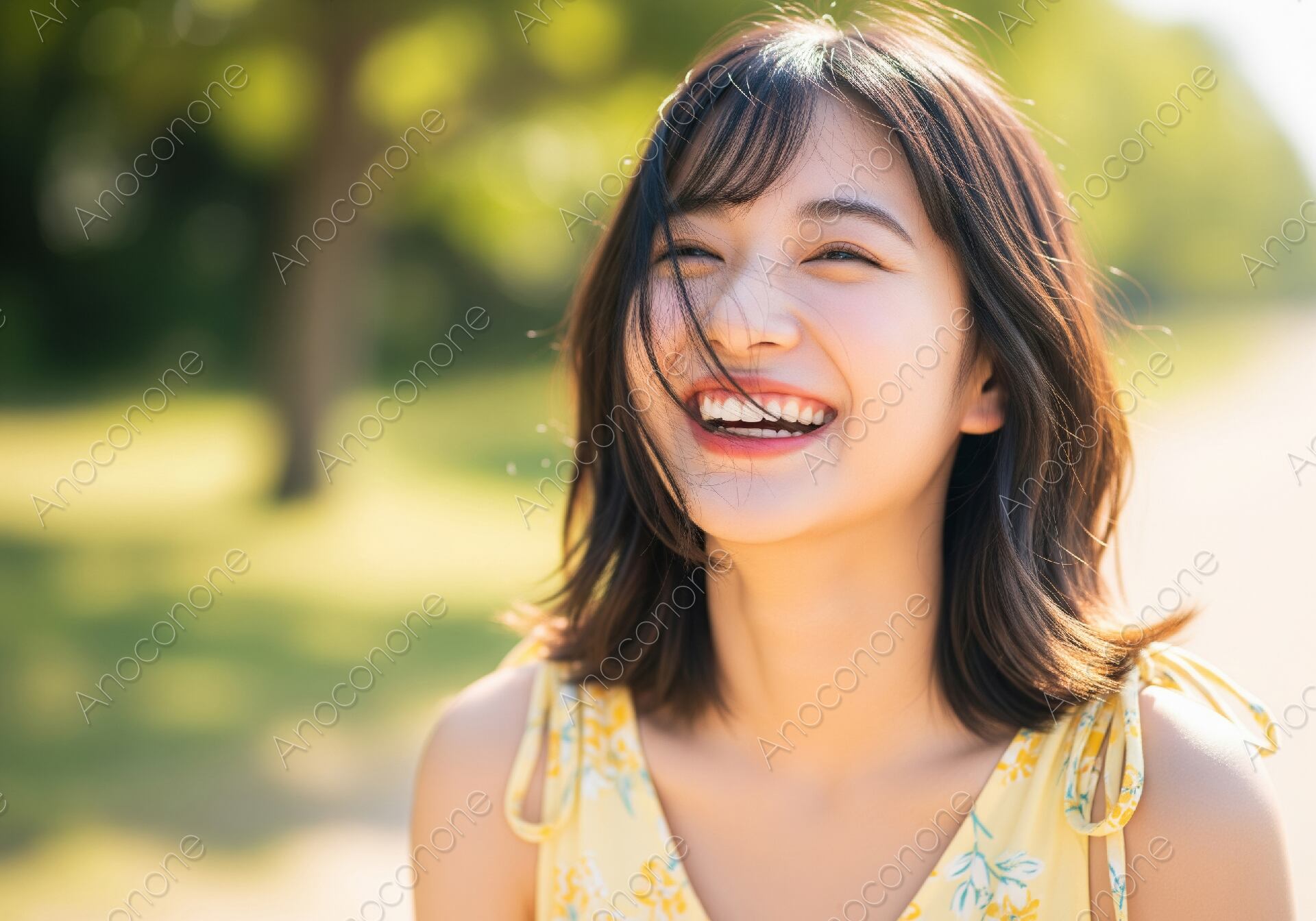 明るい陽光が降り注ぐ公園を背景に、自然体で魅力的な笑顔を見せる女性のポートレート素材です。風になびく軽やかなボブヘアが爽やかさを演出し、黄色の花柄トップスが周囲の緑と調和して健康的な印象を与えます。被写体の女性は目を細めて心から笑っており、見る側に幸福感や安心感を抱かせる豊かな表情が特徴です。背景の木々や芝生は柔らかくボケており、主役である女性の存在感をより一層際立たせています。光の当たり方が柔らかく、肌の質感や髪のディテールも鮮明に表現されており、清潔感のある構成となっています。屋外レジャー、美容、健康、旅行、ライフスタイル全般をテーマにしたウェブコンテンツや広告バナー、SNS投稿の素材として幅広く活用できます。前向きなイメージを訴求したいデザインのメインビジュアルに。