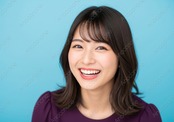 鮮やかなブルーの背景を背に、カメラに向かって弾けるような笑顔を見せる女性のポートレート素材です。落ち着いたパープル系のトップスを着用しており、背景色とのコントラストが被写体の明るい表情をより一層引き立てています。女性は肩にかかる長さのセミロングヘアで、自然な毛先の動きが活動的で親しみやすい印象を与えます。心からの喜びを感じさせる白く整った歯並びと、生き生きとした瞳の輝きが、見る人にポジティブなエネルギーを届けてくれます。肌の質感や髪のディテールも非常に細かく描写されており、全体的に清潔感と透明感のある構成となっています。広告やウェブサイトのバナー、SNSの投稿用素材など、視認性を高めつつ明るいイメージを伝えたい場面に最適です。見る人の目を引き、ブランドの好感度を高めたいデザインにぴったりの一枚です。
