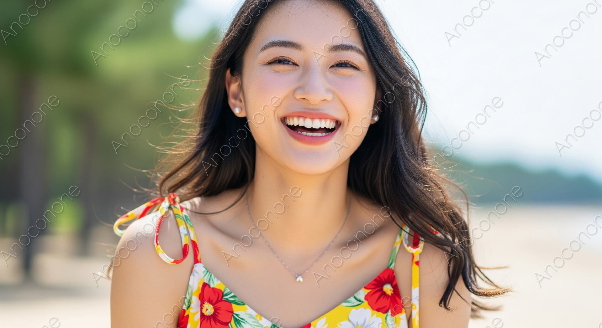陽光が降り注ぐ明るい海岸沿いで、鮮やかな花柄のキャミソールを身にまとい、満面の笑みを浮かべる女性を正面から捉えたポートレートです。背景には砂浜と並木が広がり、遠景が柔らかくぼかされていることで、彼女の生き生きとした表情がより際立っています。風にふわりとなびく黒髪や、白い歯が見えるほど明るい笑顔が印象的で、夏のリゾート地での開放的な雰囲気を感じさせます。胸元の繊細なネックレスやパールのピアスが、カジュアルな装いの中に上品なアクセントを添えており、日常の幸せな瞬間を切り取ったような一枚です。肌の質感や服の模様まで丁寧に描写されており、全体的に鮮やかでクリアな色彩で構成されています。親しみやすさと透明感を兼ね備えた、自然体の美しさが魅力です。旅行やレジャーをテーマにした広報素材に活用いただけます。