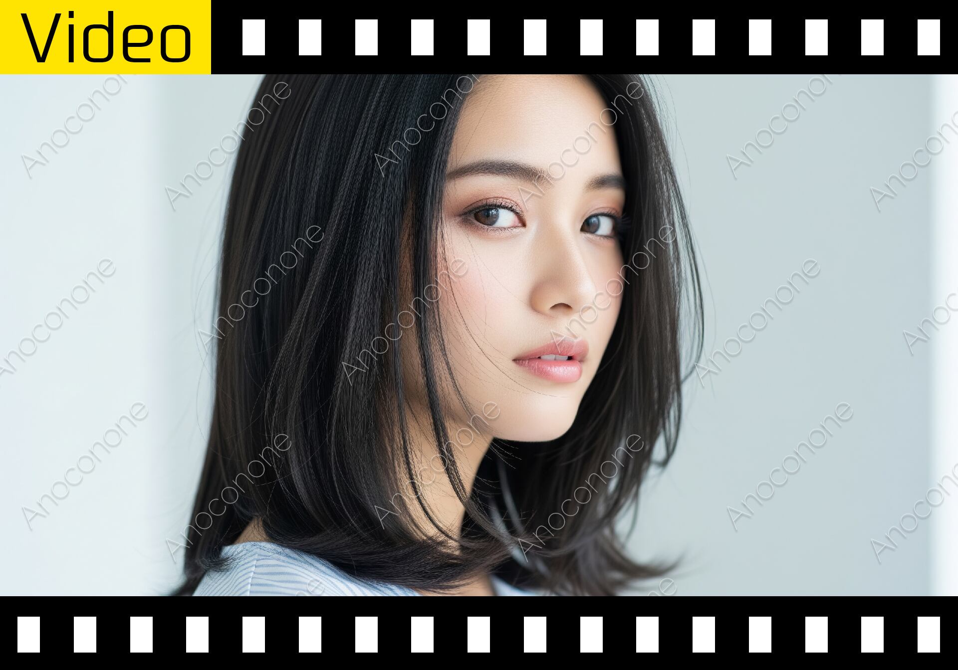 清潔感のある白を基調とした空間で、美しい黒髪のミディアムヘアが印象的な若い女性を捉えたポートレート動画です。女性はカメラに対して斜めに立ち、風を受けて自然になびく髪の質感とともに、穏やかで芯の強さを感じさせる眼差しを向けます。最初は落ち着いた表情ですが、徐々に唇をほころばせ、最後は晴れやかで親しみやすい笑顔を見せます。自然光のような柔らかな光が彼女の健康的な肌と髪のツヤを美しく際立たせ、映像全体に透明感と上質な雰囲気を与えています。風による髪の動きが、静止画では表現できない躍動感とドラマチックなニュアンスを演出します。ヘアケア製品や化粧品の広告、美容医療、ファッション、ライフスタイル、健康をテーマにしたコンテンツに最適です。女性の持つ自然な美しさと、前向きな変化を予感させる表情は、視聴者の心に深く残り、ブランドのイメージアップに貢献するでしょう。細部まで鮮明な4K映像で、多様なプロモーション用途にご活用いただけます。美容業界のブランドイメージを象徴する映像素材としてぜひご活用ください。