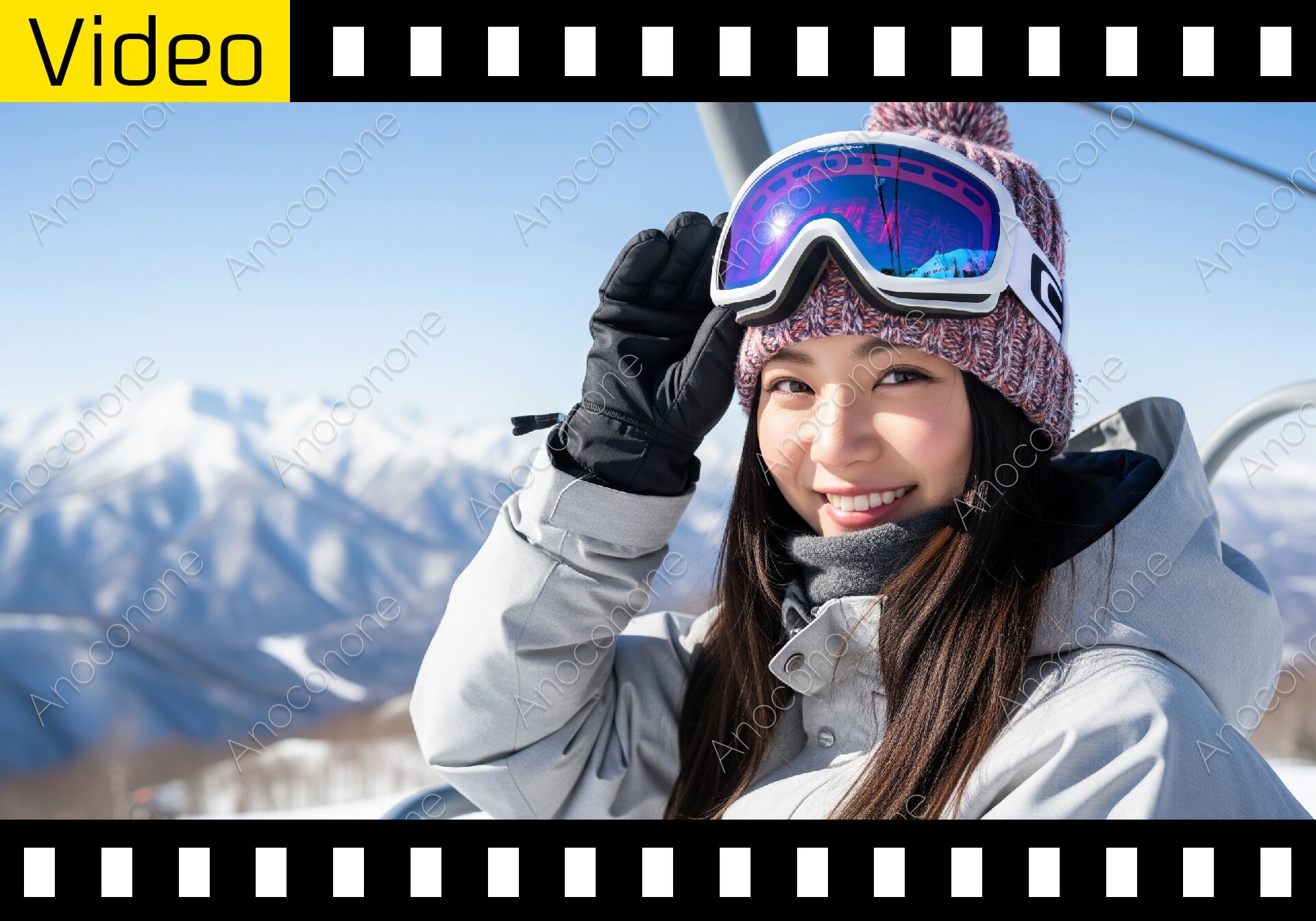 動画素材:冬の雪山でスキーリフトに乗り笑顔を見せる女性