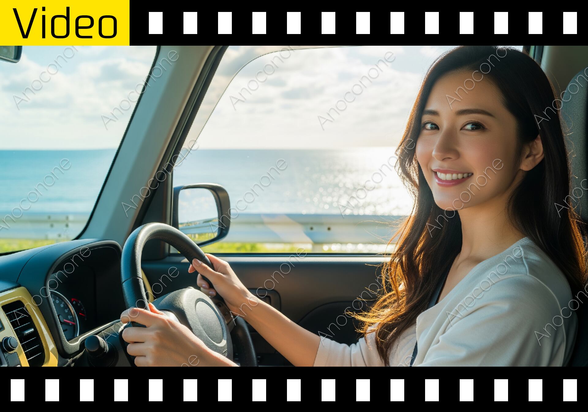 窓の外に広がる青い海と、キラキラと輝く水面が印象的な海岸沿いの道路を車で走る女性の姿を捉えた動画素材です。明るい日差しが車内に差し込み、運転席に座る女性はハンドルをしっかりと握りながら、時折カメラに向かって穏やかな微笑みを見せています。白いブラウスを身にまとい、リラックスした様子でドライブを楽しむ彼女の表情からは、休日を満喫しているような充実感が伝わってきます。背景には流れるように過ぎ去る海岸線の景色が映し出され、スピード感と開放感のある映像に仕上がっています。髪がわずかに揺れる様子や、サイドミラー越しに見える景色の変化などが、実際の走行シーンのような臨場感を演出しています。車内の質感や女性の肌の描写も細部まで鮮明であり、自然な光の当たり方が映像全体の透明感を高めています。旅行のプロモーションやカーライフ、ライフスタイル全般をテーマにしたコンテンツに幅広く活用できる内容です。ドライブやレジャーをテーマにした広告映像に活用いただけます。
