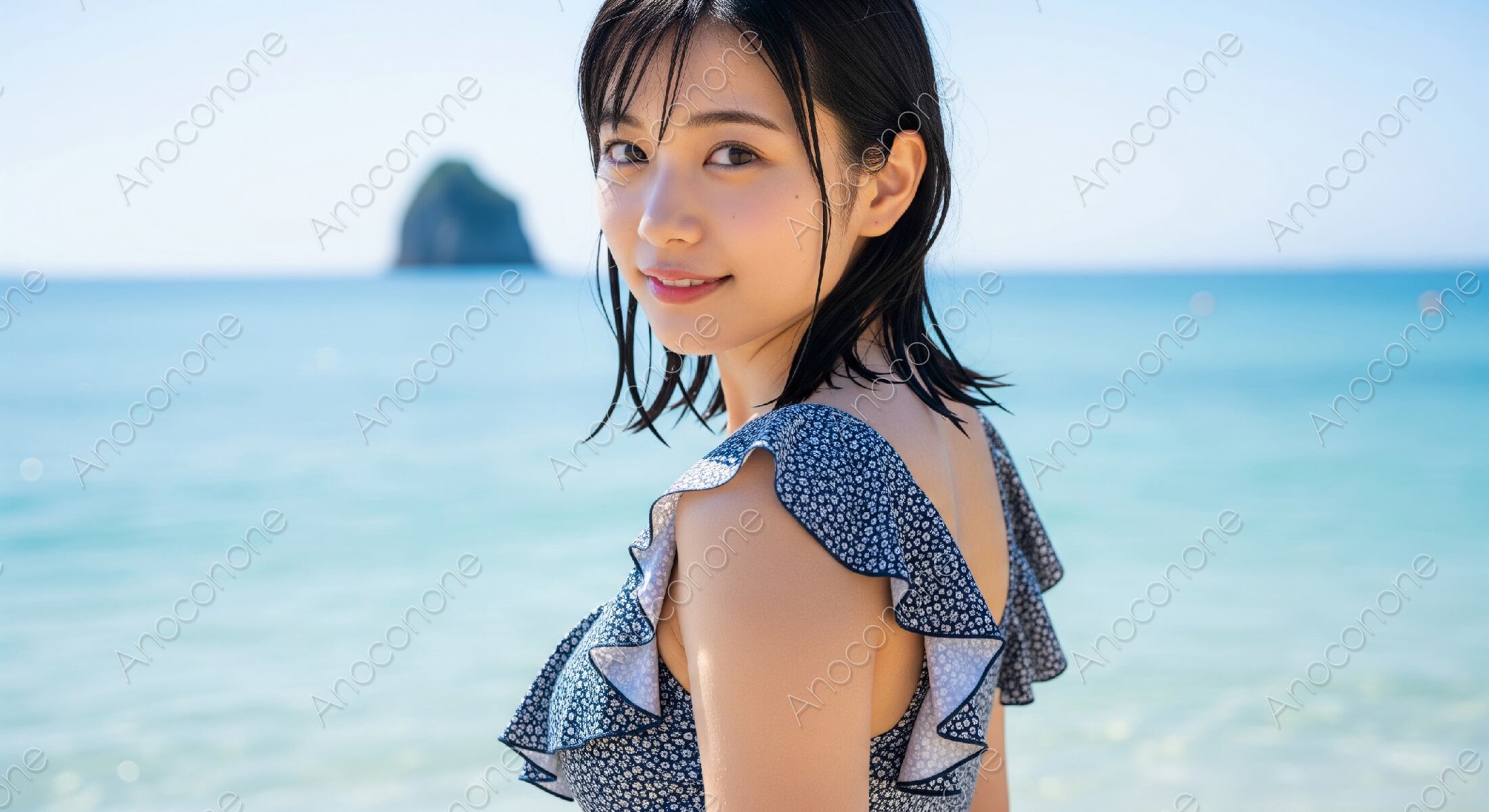 晴天に恵まれた美しいビーチで、カメラを振り返りながら穏やかに微笑む女性の姿を捉えた一枚です。背景には透明度の高いエメラルドグリーンの海と、遠くに浮かぶ小島が重なり、夏の爽やかな空気感を演出しています。女性が着用している水着は、落ち着いたネイビーを基調とした小花柄のデザインで、肩口にあしらわれた大きなフリルが華やかさと可愛らしさを添えています。少し濡れたような質感の黒髪が、海辺でのひとときを自然に表現しており、背景のボケ味が主役である女性の存在感をより一層引き立てています。太陽の光が肌に優しく反射し、清潔感のある明るい印象を与える構図となっています。砂浜の白さと海の青、そして水着のコントラストが調和しており、リゾート地でのリラックスした瞬間を感じさせます。人物の表情も自然体であり、見る人に安心感と親しみやすさを与えるような仕上がりです。