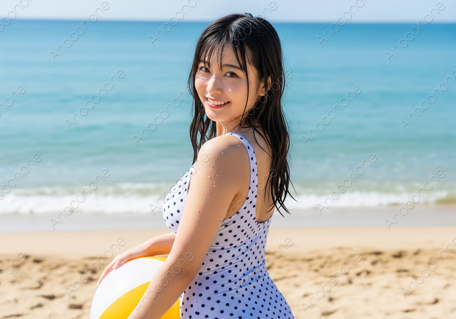 どこまでも続く青い海と広大な砂浜を背景に、白地に紺のドット柄が映える水着を着用した女性が、ビーチボールを手に微笑んでいる爽やかな一枚です。女性の背後には波打ち際が広がり、寄せては返す波の白さが夏の海岸の心地よさを強調しています。手に持っているビーチボールは黄色と白のシンプルな配色で、全体の色彩を明るく引き立てる要素となっています。女性の髪は海風を受けたような柔らかな質感で、肩に落ちる黒髪が清楚で健康的な印象を与えます。自然光が均一に当たっており、肌の艶や水滴の細かな表現が非常にクリアに描写されています。背景の海のグラデーションと砂浜の質感がバランスよく配置されており、全体として開放感あふれる構図です。清潔感のある笑顔と落ち着いた色使いが特徴で、夏の観光レジャー、ファッション、ライフスタイルを提案する広告やWebコンテンツの素材として適しています。