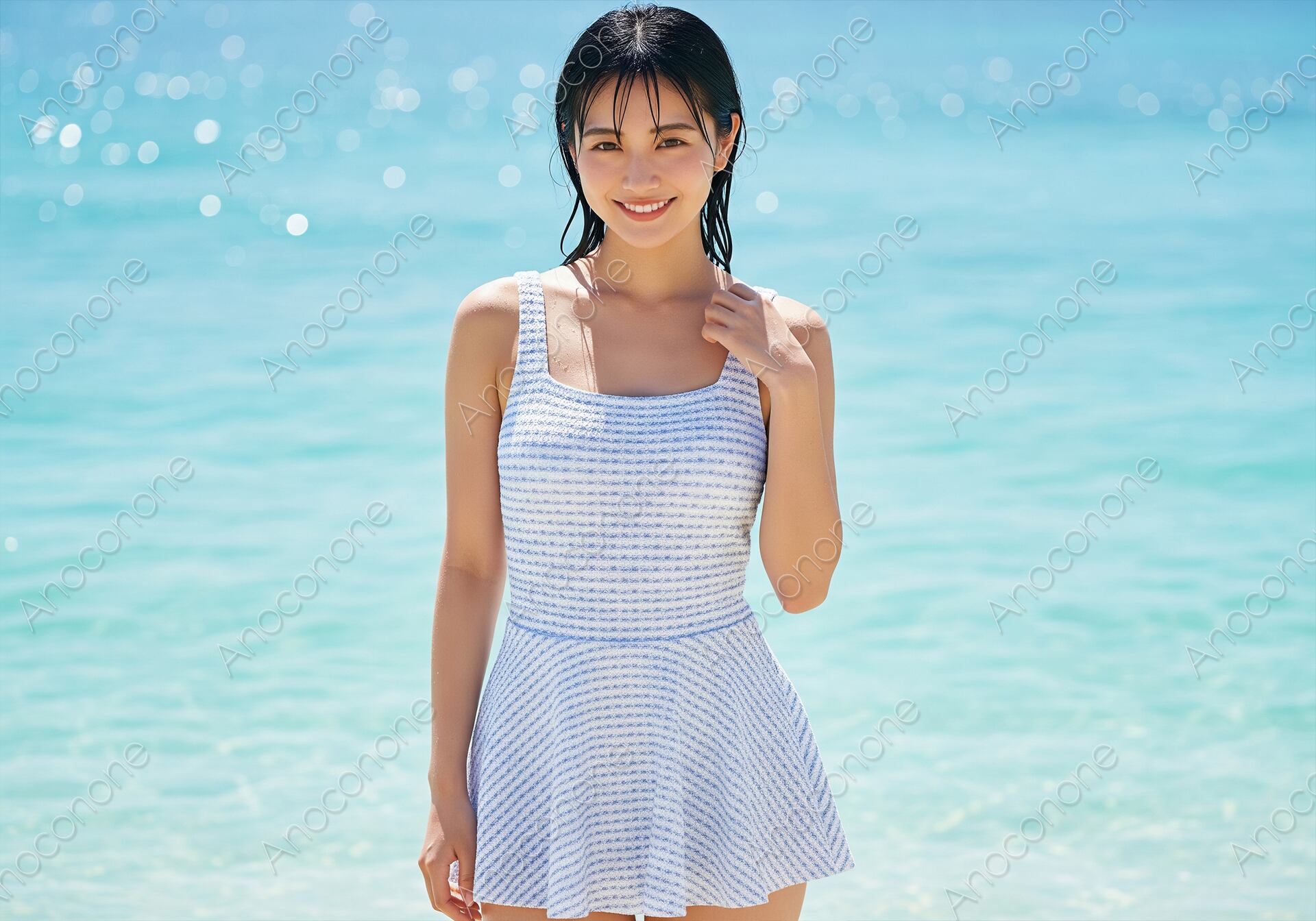 透明度の高い美しい海を背景に、清潔感あふれる水着姿の女性がこちらを向いて微笑んでいます。彼女が着用しているのは、白と淡いブルーのボーダー柄が爽やかなワンピースタイプの水着で、スカートのような裾のラインが可憐な印象を与えます。濡れた質感の黒髪が、日差しを浴びてキラキラと輝く水面と調和し、夏休みのひとときを思わせる生き生きとした表情を引き立てています。背景には穏やかな波が広がり、遠くの水面が太陽の光を反射して美しくきらめいている様子が表現されています。肌に当たる柔らかな光や、水着の生地が持つ細かい質感が非常に鮮明に描写されており、開放感のあるリゾート地の空気が伝わってくるような高品質な一枚です。全体的に明るく爽やかなトーンで統一されているため、見る人に清涼感と癒やしを与えます。夏の旅行特集やレジャー関連のプロモーション、スキンケア製品のイメージビジュアルなどに最適な作品です。