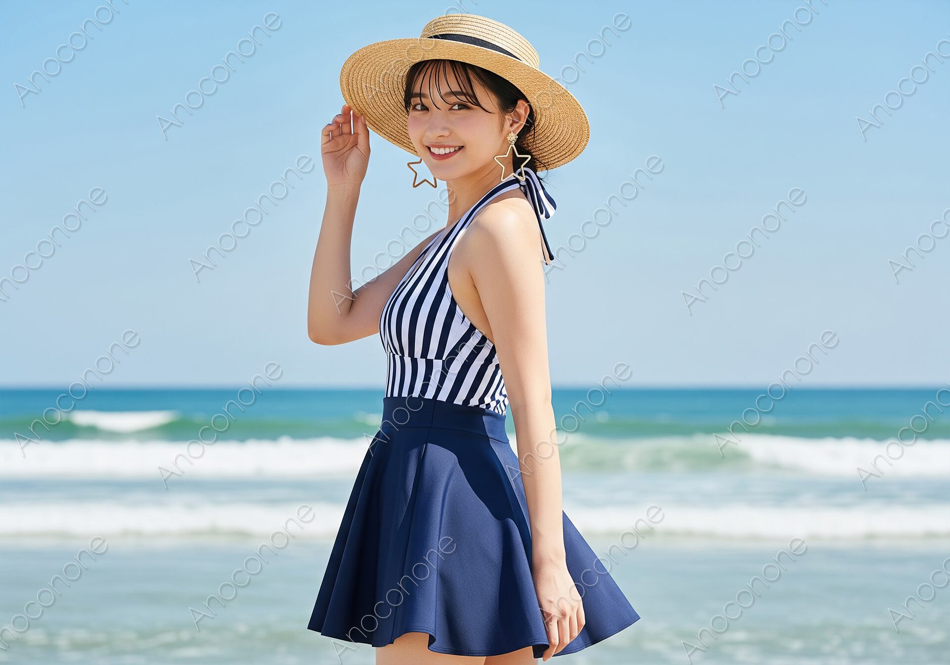 どこまでも続く青い空と穏やかな波が打ち寄せる海岸を背景に、夏らしい装いの女性が爽やかな笑顔を浮かべています。彼女は紺と白のストライプ柄が目を引くホルターネックの水着に、同系色のフレアスカートを合わせた、上品で可愛らしいビーチスタイルを披露しています。頭元には大きなリボンがアクセントになった麦わら帽子を被り、手で軽く縁を押さえる仕草が夏の陽だまりのような温かさを感じさせます。耳元で揺れる星型の大きなピアスが遊び心を添え、彼女の明るい表情をより一層華やかに引き立てています。背景の海は美しいグラデーションを描き、白く泡立つ波がリズムよく砂浜へと届く様子が丁寧に表現されています。太陽の光を浴びた肌の滑らかな質感や、帽子の網目、水着の生地の風合いまで非常に細かく描写された高品質な画像です。見ているだけで開放的な気分になれるこの一枚は、夏のレジャー特集や旅行のパンフレット、リゾートウェアの広告など、季節感を大切にしたい様々な媒体のメインビジュアルとしてご活用いただけます。