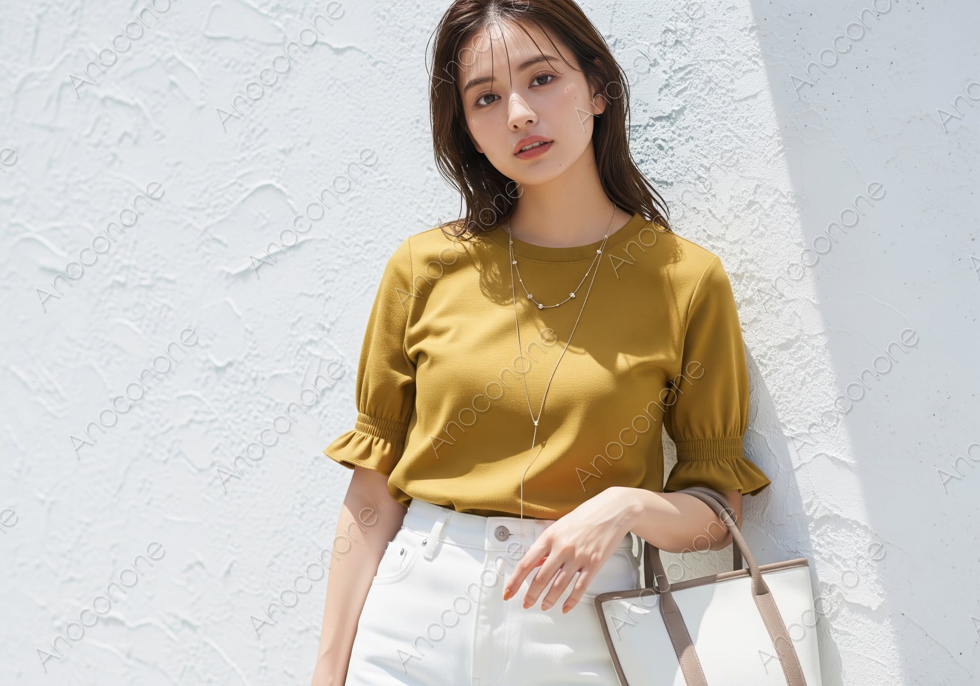 白く凹凸のある壁を背景に、落ち着いたマスタードイエローのトップスを着た女性が立っています。トップスの袖口にはフリルのような装飾があり、手首をすっきりと見せるデザインです。首元には細身のゴールドのネックレスが二重に重なり、胸元まで長く伸びるチャームがアクセントになっています。ボトムスには清潔感のある白いパンツを合わせ、手には白とベージュの配色がなされたトートバッグを持っています。女性の髪は自然なウェーブがかかったロングヘアで、肩にかかる長さです。陽光が右側から差し込み、壁や衣服に柔らかな陰影を作っています。表情は穏やかで、こちらを静かに見つめる様子が捉えられています。全体的に暖色と白のコントラストがはっきりしており、夏の外出や日常のひとコマを感じさせる構成です。肌の質感や衣服の布地、背景の壁の細かなディテールまで明瞭に描写されています。