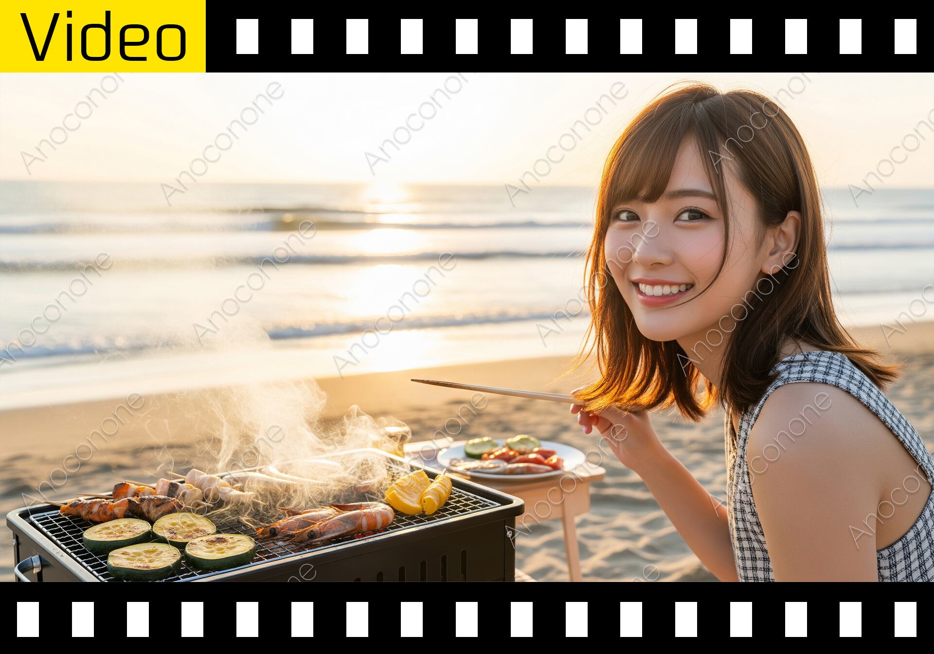 日が沈み始めた美しい海岸線で、一人の女性がバーベキューを楽しんでいる光景です。波静かな海を背景に、夕日が良い雰囲気を演出しています。女性は笑顔でコンロに向かい、手元の箸を使って食材の状態を確認したり、カメラに視線を送ったりしています。コンロの上では、エビやズッキーニ、パプリカ、肉の串焼きなどが焼かれており、食材からは食欲をそそる煙が立ち上っています。女性が座るテーブルの脇には、焼く前の食材が盛り付けられた皿も用意されています。浜辺の砂、穏やかに寄せる波、そしてオレンジ色に染まり始めた空が、このくつろいだ時間を表現しています。女性の服装は、涼しげなノースリーブのデザインです。カメラは女性の横からその様子を捉え、自然な動きと周囲の景色を収めています。ビーチでのレジャー、夕暮れの風景、アウトドア料理、旅行、休暇、そして女性の笑顔といったテーマに関連する映像です。