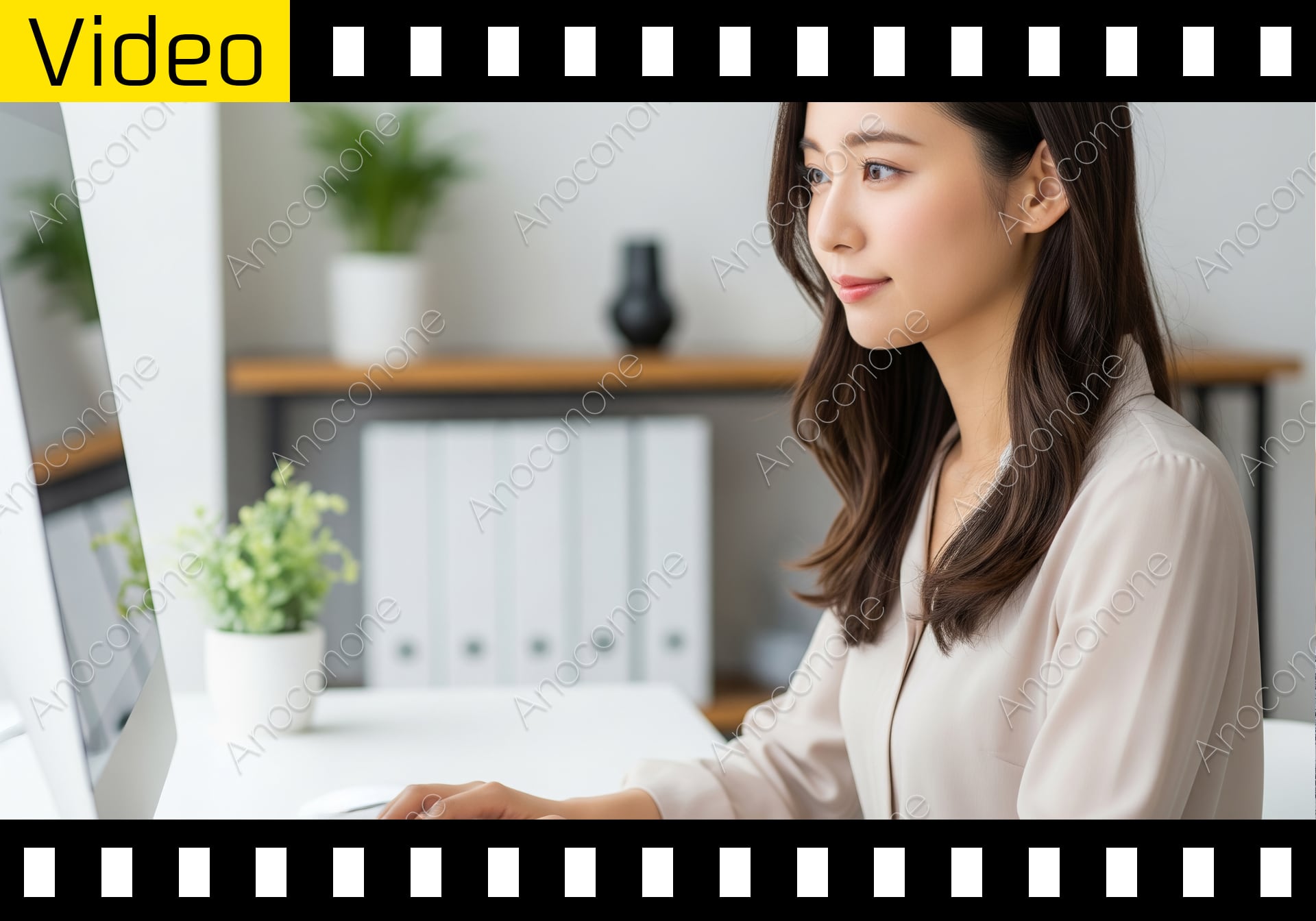 明るいオフィス環境で、一人の女性がデスクに向かい、デスクトップパソコンを操作している様子です。女性は落ち着いたベージュ色のブラウスを着用しており、長い髪を自然に下ろしています。デスクの上には、大きな画面のモニター、キーボード、マウスが配置されています。女性はキーボードをリズミカルにタイピングしており、時折モニター画面に視線を移しながら作業を進めています。その表情は真剣でありながらも、穏やかで、集中して業務に取り組んでいることが伺えます。画面の右側に見えるデスク周りには、白い鉢に入った観葉植物や、白いファイルボックスが整然と並べられており、整理された働きやすい環境であることが描写されています。背後の壁や棚はシンプルで、全体的に清潔感のある空間です。カメラは女性の右斜め前から、作業中の横顔とデスク環境を捉えており、自然な光が差し込むオフィスの雰囲気を伝えています。ビジネス、IT、一般事務、リモートワーク、女性の働き方といったテーマの映像素材として使用できます。