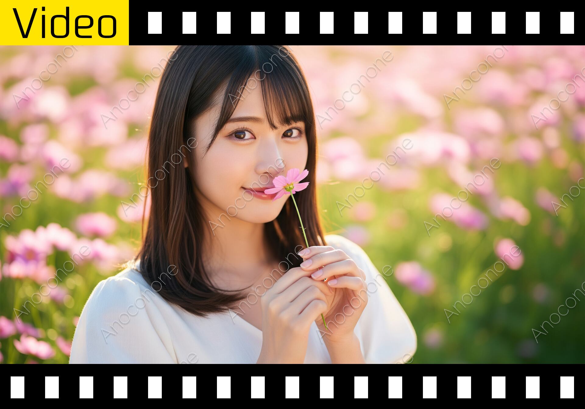 満開のコスモス畑の中で、一人の女性が佇んでいる風景です。女性は白いパフスリーブのブラウスを着用しており、肩ほどの長さの黒髪が自然な印象を与えます。彼女はピンク色のコスモスを一輪、両手で大切そうに持っています。動画の冒頭では、女性はカメラをじっと見つめ、優しく微笑んでいます。その後、彼女はゆっくりと目を閉じ、手に持ったコスモスの香りを愛おしむような仕草を見せます。そして再び目を開けると、視線を斜め上へと移し、穏やかな表情で遠くを見つめます。背景には、ピンクや白のコスモスが画面いっぱいに広がっており、風に揺れる様子が映し出されています。夕方近くの自然光がコスモス畑と女性を照らし、全体的に温かみのある柔らかな雰囲気です。カメラは女性の上半身を捉えており、背景の花々は美しくボケています。自然の美しさ、癒やし、秋の風景、純粋さといったテーマを表現する映像として使用できます。