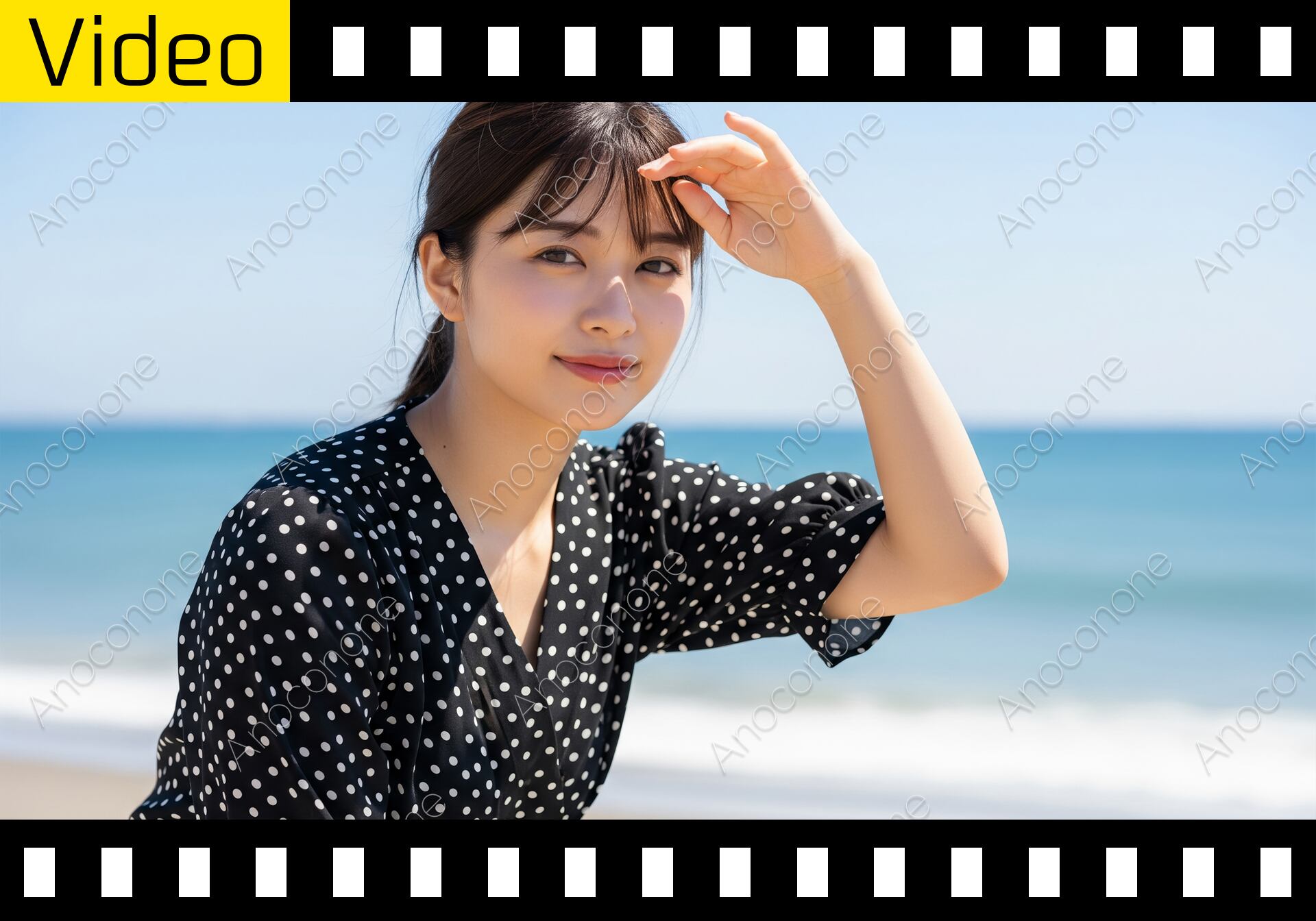 晴れ渡った空と青い海が広がる砂浜で、水玉模様の黒いブラウスを着た一人の女性が過ごしている様子です。女性は髪を後ろでまとめており、自然な光を浴びながらカメラに向けて穏やかな微笑みを見せています。動画の冒頭では、差し込む日差しを遮るように手を額にかざしていますが、ゆっくりと手を下ろしながら視線をこちらへと向け、落ち着いた表情に変わっていきます。背景には白く波打つ海辺と、地平線まで続く澄んだ青空が広がっており、開放感のある爽やかな雰囲気が感じられます。風によって女性の髪がわずかに揺れ、浜辺の心地よい空気感が伝わってきます。カメラは女性の斜め前から上半身を中心に捉えており、背景の海は柔らかくぼかされています。夏休み、観光、リゾート地、ファッション、自然との触れ合い、そして女性の日常といったテーマを表現する映像として活用できます。