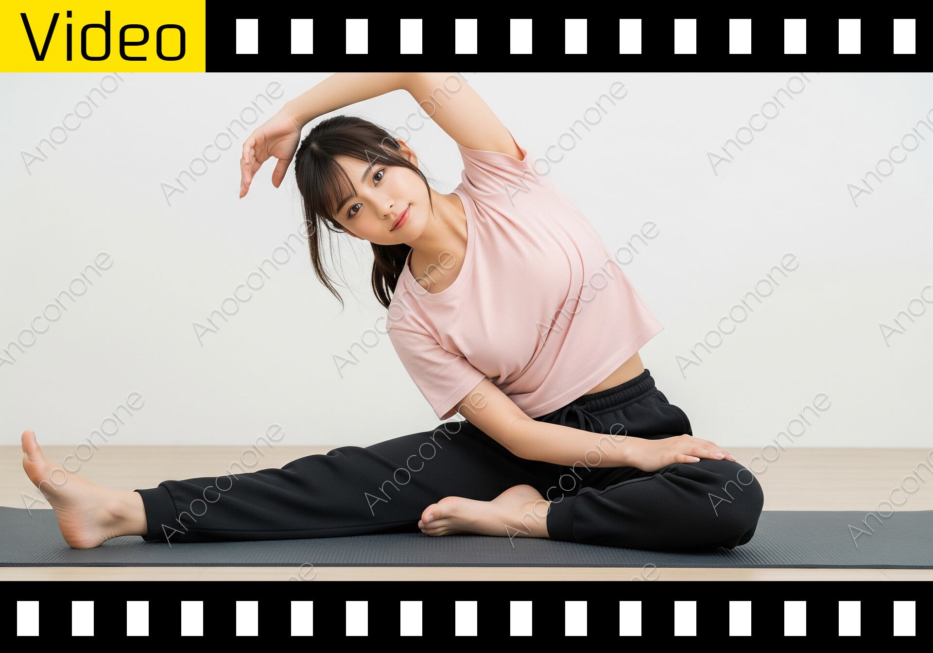 落ち着いた室内のマットの上で、入念にストレッチを行っている女性の映像です。女性は薄いピンク色のTシャツに黒いパンツを合わせたスポーティーな服装で、髪を後ろでまとめています。動画の前半では、座った状態で片方の腕を頭の上に回し、脇腹をゆっくりと伸ばす動作をしています。その後、大きく脚を開いて前に倒れ込み、体全体の柔軟性を高めるようなストレッチへと移ります。彼女の動きは滑らかで、自身のペースで静かに体と向き合っている様子が伺えます。背景は無地の白い壁と木目調の床で構成されており、余計なものが視界に入らないため、ストレッチの動作に集中できる環境が整っています。カメラは女性の正面からその一連の動きを捉えており、適度な距離感で全体のフォームを確認することができます。自宅でのトレーニング、健康維持、リラクゼーション、朝の習慣といったテーマを表現する映像素材として適しています。健康への意識が高い層や、自宅で手軽に運動を始めたいと考えている方へ向けたコンテンツに活用しやすい内容です。