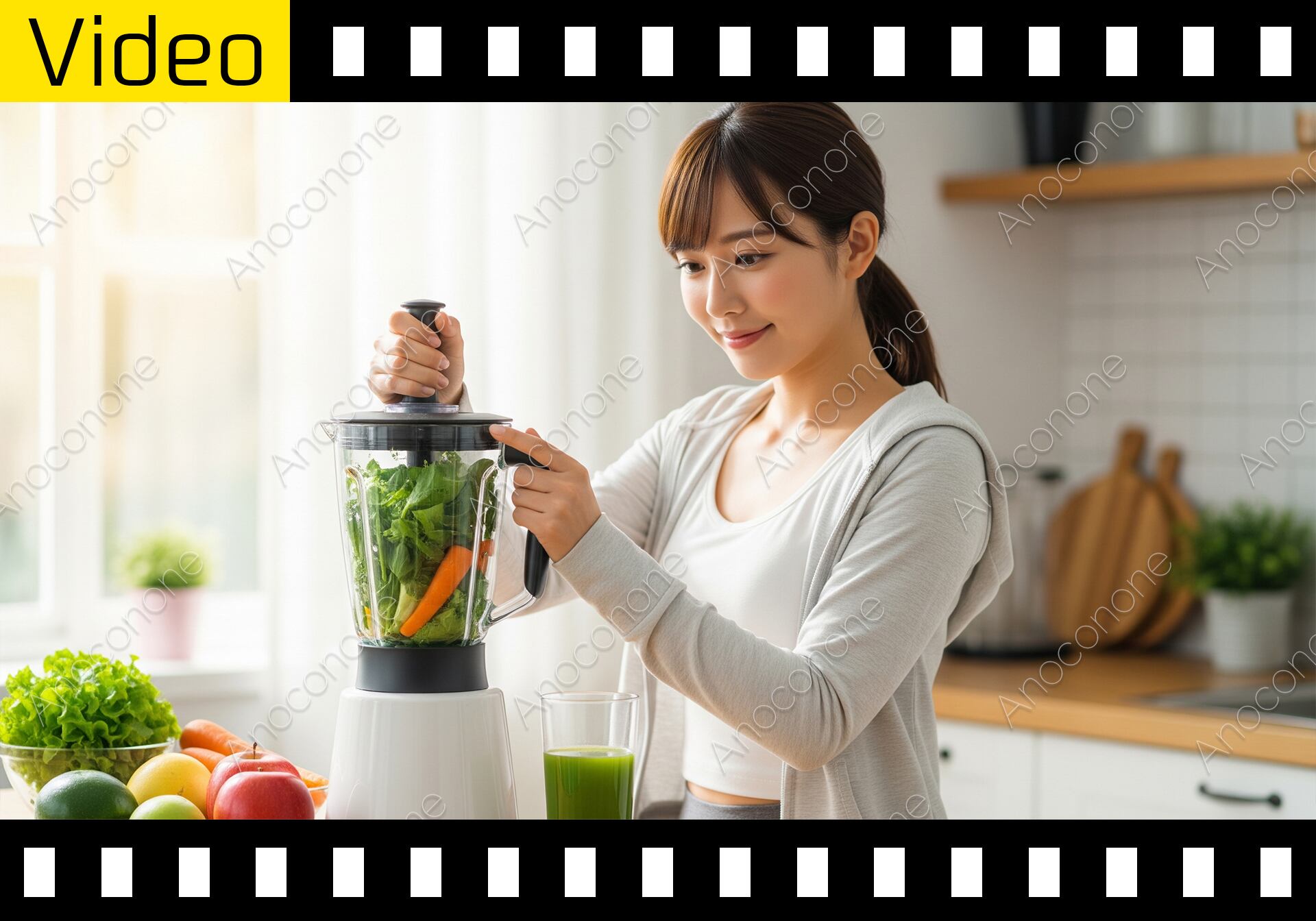 明るい日差しが差し込む清潔感のあるキッチンで、一人の女性がフレッシュなグリーンスムージーを作っている様子です。女性はグレーのパーカーを着用し、髪を後ろでまとめており、健康的な印象を与えます。彼女はミキサーの蓋を右手でしっかりと押さえながら、左手でスイッチを入れます。ミキサーの中には、ほうれん草や人参などの野菜がたっぷりと入っており、スイッチを入れると一気に撹拌され、鮮やかな緑色のスムージーへと変化していきます。女性はミキサーが動いている間、中身が混ざっていく様子を穏やかな笑顔で見つめており、スムージーが出来上がるのを楽しみにしているようです。ミキサーの手前には、すでに出来上がったグリーンスムージーが入ったグラスが置かれており、朝の健康的な習慣を感じさせます。背景には、木目調の棚や観葉植物、そして窓から差し込む自然光が映り込んでおり、心地よい空間です。カメラは女性の正面から、スムージー作りの一連の動作を安定して捉えています。健康志向、朝のルーティン、手作り、美容、野菜摂取、ライフスタイルといったテーマの映像素材として使用できます。また、女性の自然な笑顔と、新鮮な野菜がスムージーになっていく様子が、視聴者にポジティブで健康的な印象を与える映像となっています。健康食品や家電製品のプロモーション、または日常の穏やかなシーンを描く動画コンテンツに適した素材です。