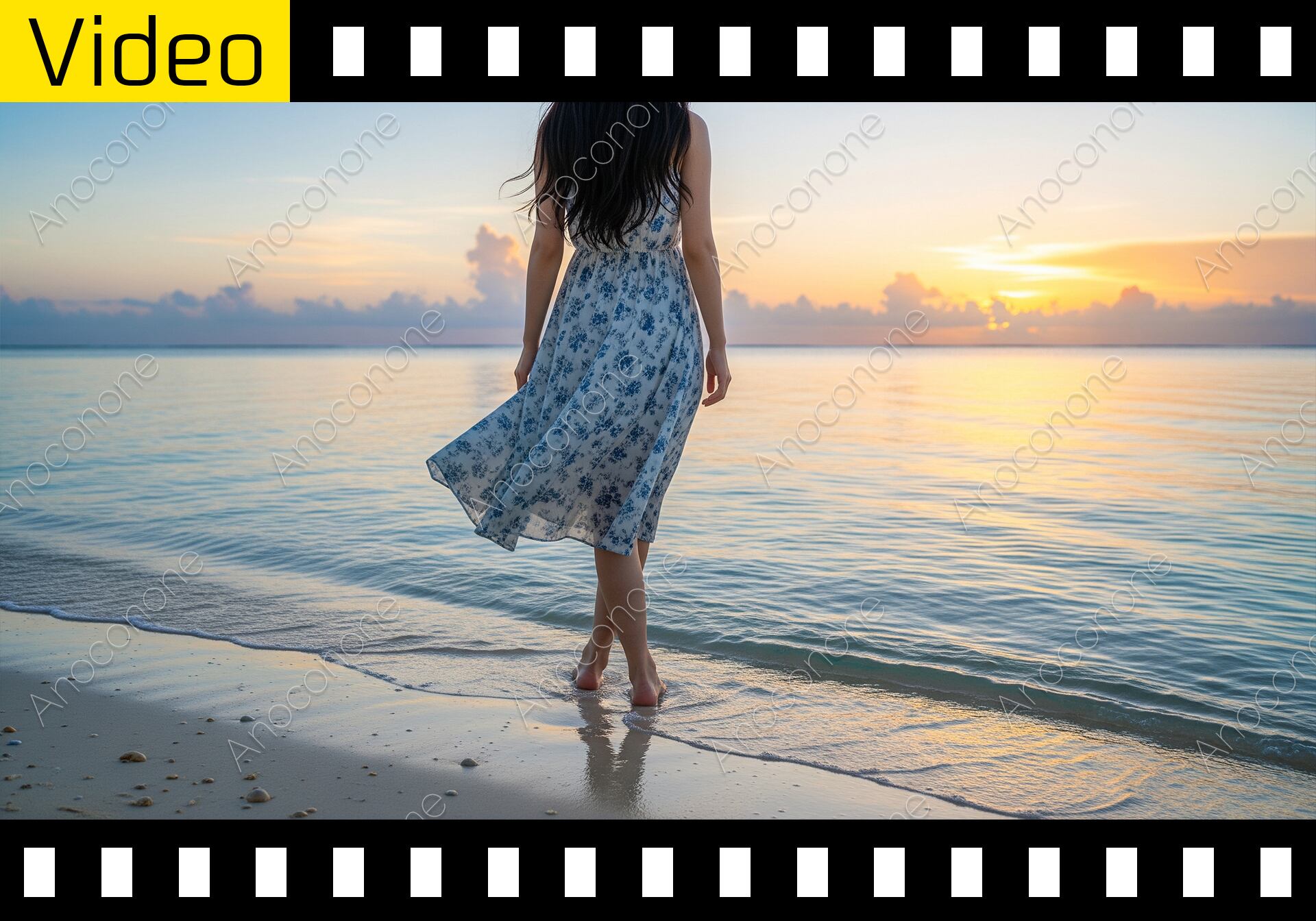 夕日が水平線に沈みゆく静かな海辺で、一人の女性が波打ち際をゆっくりと歩いている後ろ姿を捉えた映像です。女性は白地に青い花柄が描かれた清楚なワンピースを着用しており、長い黒髪が風に優しく揺れています。彼女は裸足で砂浜を踏みしめ、寄せては返す穏やかな波に足元を濡らしながら、静かに海を見つめて歩き進みます。空はオレンジ色から深い青色へと美しく染まり、雲の間から差し込む光が水面に反射して幻想的な輝きを放っています。波の音だけが聞こえてくるような落ち着いた時間が描写されており、視聴者に深い癒やしを与えます。カメラは女性の後ろから一定の距離を保ちつつ、彼女の歩みに合わせて自然に移動しています。旅行、リゾート、休暇、心の安らぎ、自然の美しさ、そして夏の終わりといったテーマを表現する映像素材として最適です。情緒的な風景と女性の佇まいが、物語性を感じさせる仕上がりとなっています。旅行プランの紹介やライフスタイル系のプロモーション動画にふさわしい素材です。
