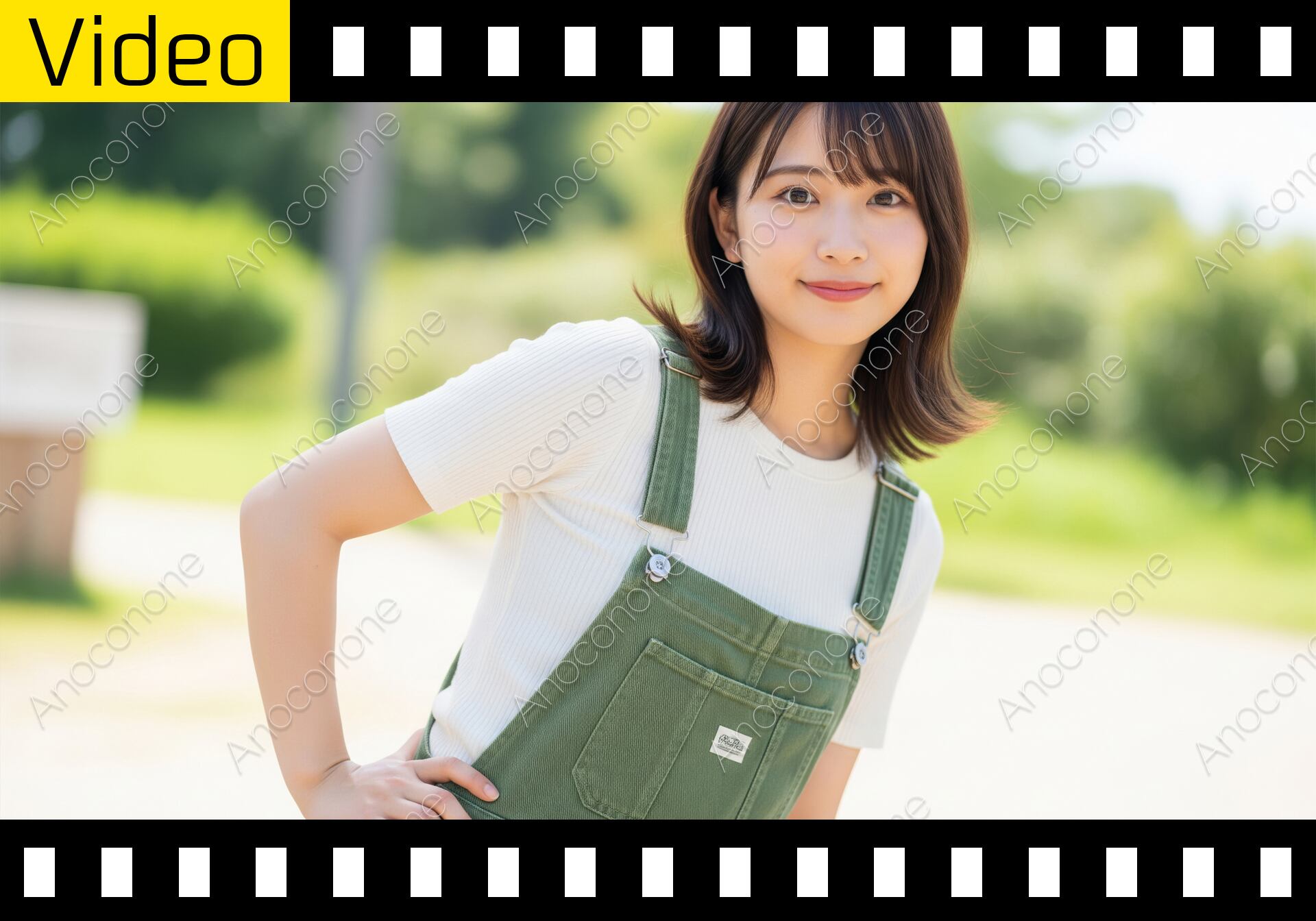 動画素材:緑豊かな公園で笑顔を見せるサロペット姿の女性