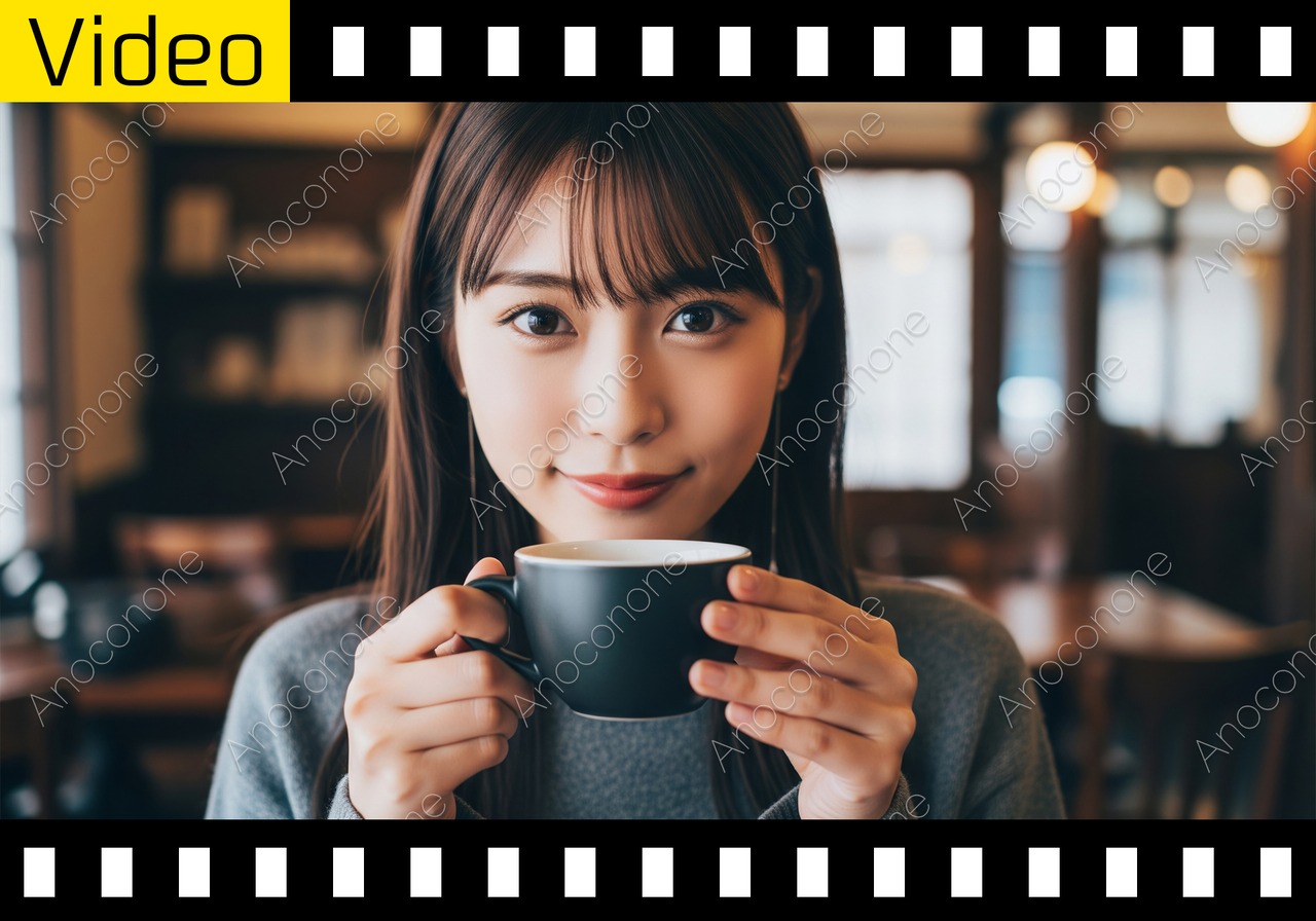 レトロな雰囲気の喫茶店で、一人の女性が温かいコーヒーを楽しみながら過ごす様子を映した映像です。女性は黒いカップを両手で大切そうに持ち、一口飲んだ後にふんわりとした優しい表情を見せます。店内は木目調の家具や柔らかな照明で構成されており、背景にはぼんやりと店内の様子が映り込んでいて、奥行きのある空間が表現されています。女性の服装はグレーのニットで、落ち着いた色合いが店内の静かな空気感とよく調和しています。カメラの焦点は女性の顔やカップにしっかりと合わされており、彼女の視線の動きや口元の変化が細かく描写されています。立ち上る湯気こそ見えませんが、カップを持つ手の仕草や飲み込む様子から、コーヒーの温かさが伝わってくるような構成です。窓から差し込む自然光と店内の照明が混ざり合い、女性の肌の質感をきれいに見せています。日常の何気ない贅沢な時間を切り取った、静かで心地よい映像素材となっています。