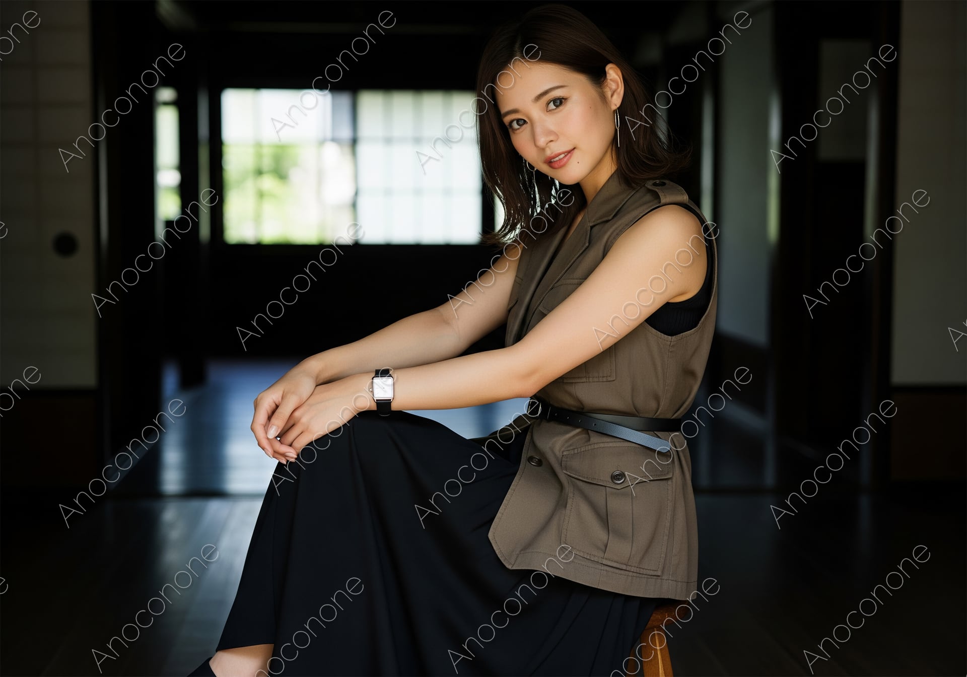 静かな和の空間で、カーキ色のミリタリー風ジレを羽織った人物が椅子に腰掛けています。ボトムスには深いネイビーのロングスカートを合わせ、ウエストを細いベルトでマークすることで、洗練された大人のコーディネートを表現しています。背景は畳や障子、板張りの廊下が続く伝統的な日本家屋の造りとなっており、奥の窓からは柔らかな光が差し込んでいます。人物は左腕にスクエア型の腕時計を着用し、耳元にはシンプルなシルバーのピアスを添えています。肩にかかる長さの髪は整えられ、こちらを静かに見つめる表情は落ち着いた印象を与えます。ジレのポケットやボタン、生地の質感、背景の木目の階調まで細部が鮮明に描写されており、明暗のコントラストが美しい構成です。モダンなファッションと古風な背景が調和し、独特の雰囲気が漂います。全体的に落ち着いた色使いでまとめられており、シックな広告表現に適した構図です。ライフスタイルやファッションを紹介する媒体での活用を見込んだ一枚です。