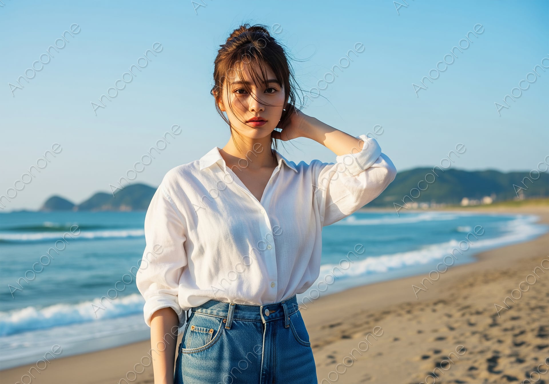 夕日が沈み始めた穏やかな海岸線にて、白いリネンシャツにブルーデニムを合わせた人物が佇んでいます。シャツは袖を無造作にロールアップし、デニムの中にタックインすることで、ラフながらも洗練された大人のカジュアルスタイルを表現しています。背景には透明感のある青い海が広がり、波打ち際が柔らかく光を反射しています。遠くには緑豊かな島や山が見え、自然の豊かさを感じさせる景色です。人物は髪をすっきりとまとめ、片手を軽く首筋に添えた自然なポーズで、静かにカメラを見つめています。夕暮れの温かい光が人物の表情や衣類の質感を際立たせ、落ち着いた雰囲気を醸し出しています。砂浜の白さと海の青さが、白いシャツを際立たせています。全体的に穏やかな色使いでまとめられており、自然体な魅力を伝える広告素材として活用できる一枚です。夏の終わりや秋の始まりをイメージさせるビジュアルで、旅行やファッションを紹介する媒体での活用に適しています。