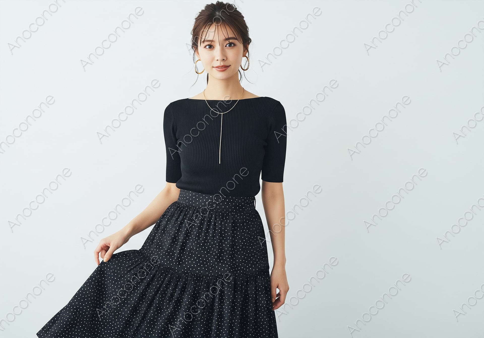 清潔感のある白を基調とした背景の前に、黒のボートネックリブニットと細かなドット柄が施されたロングスカートを合わせた人物が立っています。五分袖のニットは体のラインを程よく拾うリブ素材で、デコルテを美しく見せるボートネックのデザインが知的な印象を与えます。スカートはティアード状に切り替えられたボリュームのあるフレアシルエットで、動きに合わせて軽やかに広がる様子がエレガントです。耳元には大ぶりのゴールドフープピアス、首元には縦のラインを強調する細身のロングネックレスを添え、シンプルながらも洗練されたアクセサリー使いが目を引きます。髪は後ろでタイトにまとめられ、顔周りをすっきりと見せることで、落ち着いた表情をより際立たせています。全体を黒で統一したモノトーンコーディネートでありながら、ドット柄やアクセサリーの光沢が程よいアクセントとなり、重たさを感じさせない上品な仕上がりです。衣類の柔らかな質感や、人物の穏やかな微笑みまで鮮明に描写されており、落ち着いた大人の女性像を表現しています。アパレルブランドのカタログや、ライフスタイルをテーマにした広告素材として非常に使いやすい構図の一枚です。