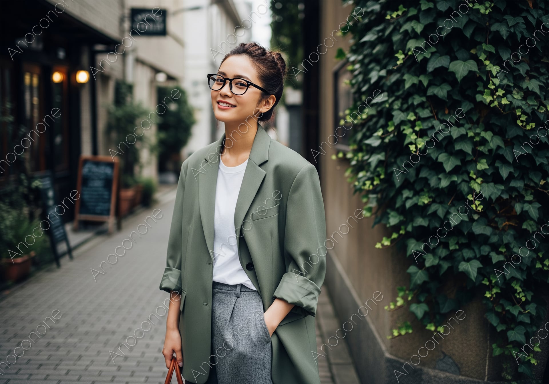 落ち着いた色合いの路地裏で、カーキ色のオーバーサイズジャケットを主役にした人物が佇んでいます。インナーにはシンプルな白Tシャツ、ボトムスにはグレーのスラックスを合わせ、袖をラフに捲り上げることで、こなれ感のあるマニッシュなコーディネートを表現しています。黒縁の眼鏡が知的なアクセントとなり、髪をすっきりとまとめ上げることで、顔周りを明るく清潔感のある印象に見せています。背景の壁には瑞々しいアイビーの葉が密に茂り、都会的な街並みの中に自然の彩りを添えています。人物はポケットに片手を入れ、柔らかな微笑みを浮かべてこちらを見つめており、親しみやすさと自立した大人の余裕を感じさせます。ジャケットの柔らかな生地感やスラックスの質感、背景の葉一枚一枚のディテールまで鮮明に描写されており、光の当たり方も自然で落ち着いたトーンです。オフィス街の路地や、おしゃれなカフェが並ぶ通りを散策するような、洗練された日常の一コマを切り取っています。都会的なライフスタイルや、秋口のファッションをテーマにした広告素材として非常に使いやすい構成です。
