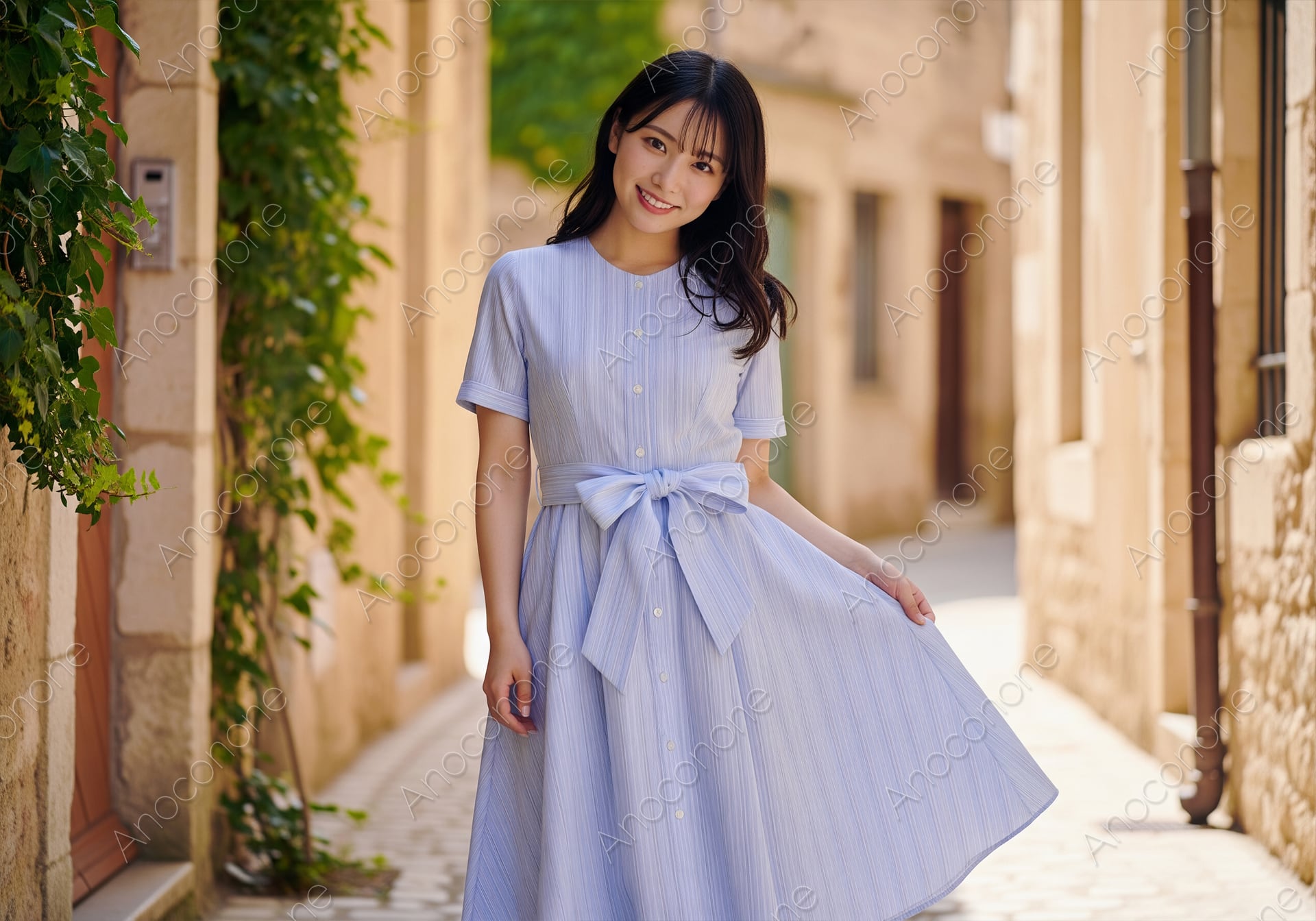 柔らかな陽光が降り注ぐ石畳の路地にて、淡い水色のストライプ柄ワンピースを纏った人物が微笑んでいます。ワンピースは半袖のシャツタイプで、フロントに並ぶ白いボタンと、ウエスト部分で大きく結ばれたリボンが清楚で華やかな印象を与えます。スカート部分は裾に向かって緩やかに広がるフレアシルエットになっており、軽やかで涼しげな雰囲気を醸し出しています。背景には、温かみのあるベージュ色の石壁が続く古い街並みが広がり、左側の壁面には瑞々しい緑のツタが這っています。奥行きのある路地がヨーロッパの旧市街のような情緒ある景色を作り出し、被写体のナチュラルな美しさを引き立てています。人物は首を軽く傾け、自然な表情でこちらを見つめており、親しみやすさと上品さが同居しています。生地の細かなストライプ模様やリボンの質感、背景の石材の風合いに至るまで鮮明に描写されており、全体として調和の取れた美しい構図です。夏の旅行や休日のお出かけをイメージさせるビジュアルで、清潔感溢れるライフスタイルの提案に適しています。アパレルや観光プロモーションなど、幅広い用途で活用できる一枚です。