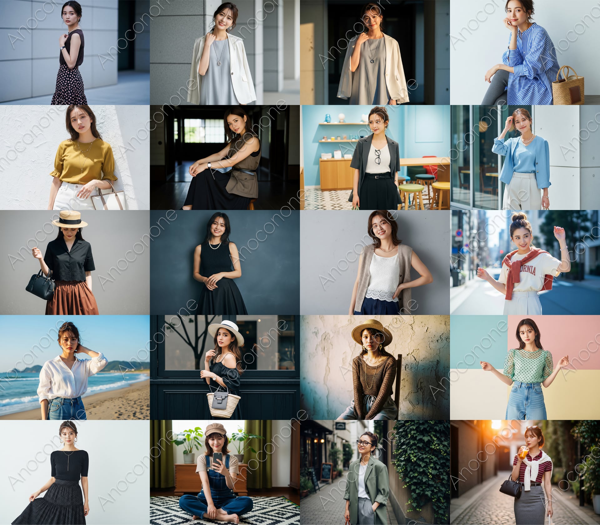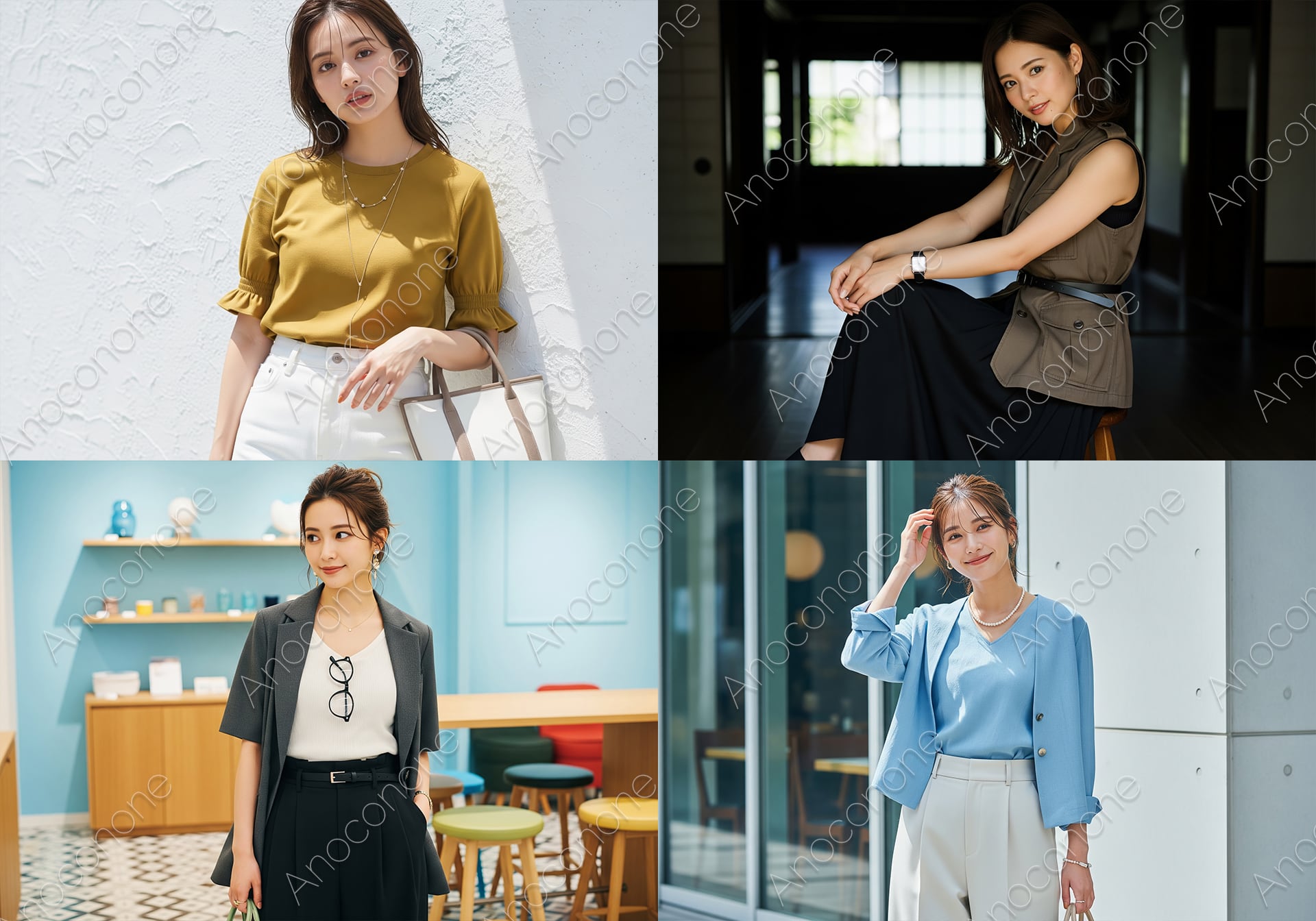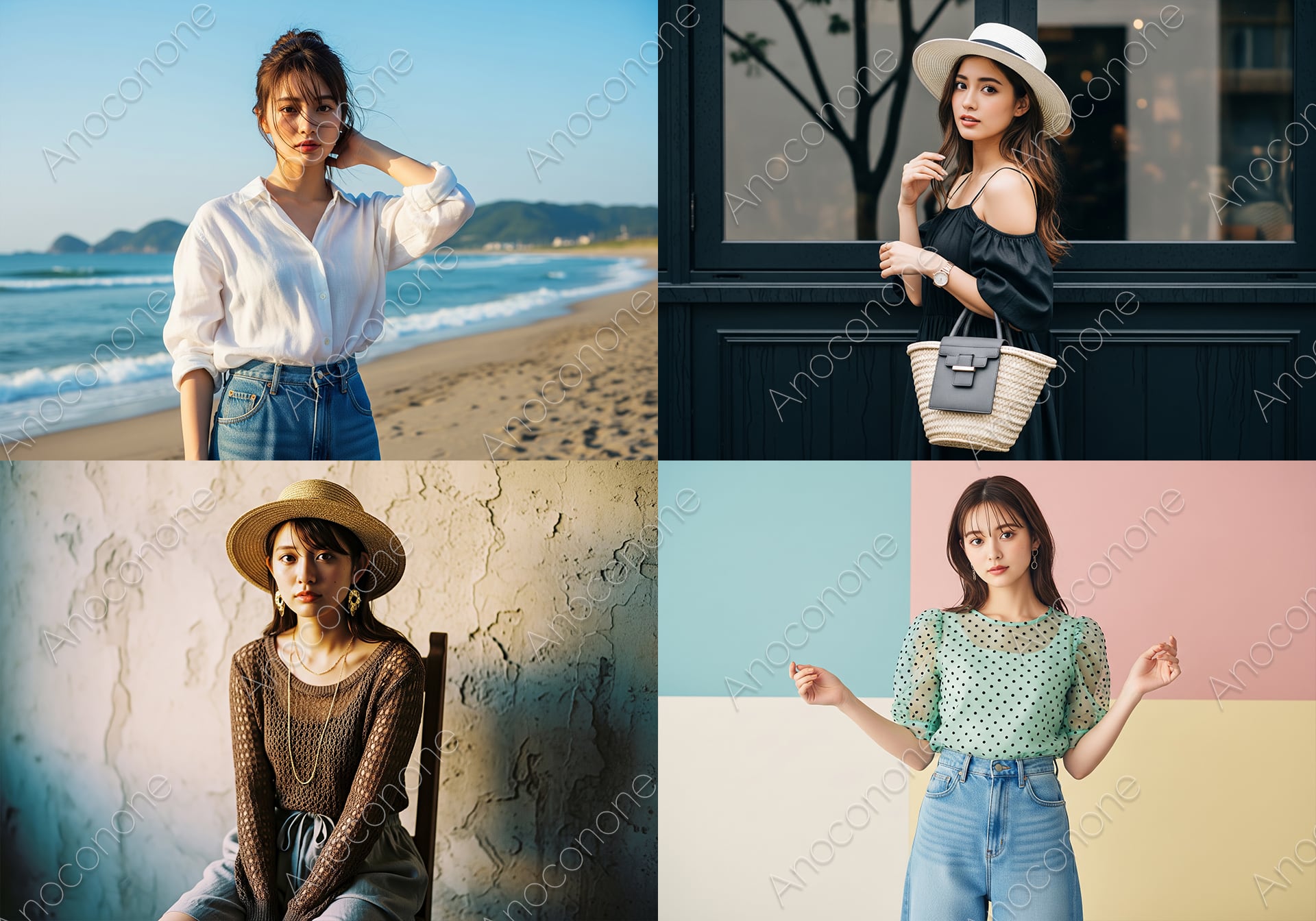 都会的なオフィス街、静かな室内、開放的な海辺など、さまざまな背景とともに女性の多彩なライフスタイルを表現した画像素材集です。ジャケットを羽織った知的なスタイルから、麦わら帽子を合わせたカジュアルな装い、シックな黒のドレスまで、幅広いファッションスタイルをバランスよく収録しています。各画像は、光の当たり方や構図にこだわり、広告やウェブサイト、SNS投稿、ブログのアイキャッチなど、多岐にわたるクリエイティブな用途でそのまま使用できる品質を備えています。人物の表情も、柔らかな笑顔から落ち着いた真剣な眼差しまでバリエーションが豊富で、伝えたいメッセージに合わせて最適な1枚を選ぶことができます。